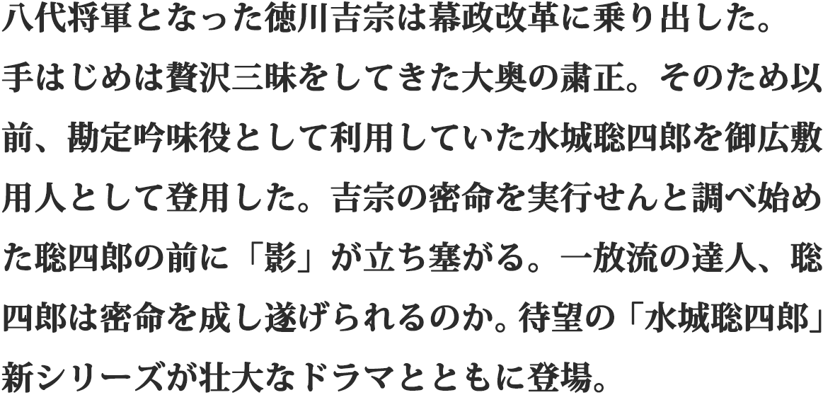 八代将軍となった徳川吉宗は幕政改革に乗り出した。手はじめは贅沢三昧をしてきた大奥の粛清。そのため以前、勘定吟味役として利用していた水城聡四郎を御広敷用人として登用した。吉宗の密命を実行せんと調べ始めた聡四郎の前に「影」が立ち塞がる。一放流の達人、聡四郎は密命を成し遂げられるのか。待望の「水城聡四郎」新シリーズが壮大なドラマとともに登場。